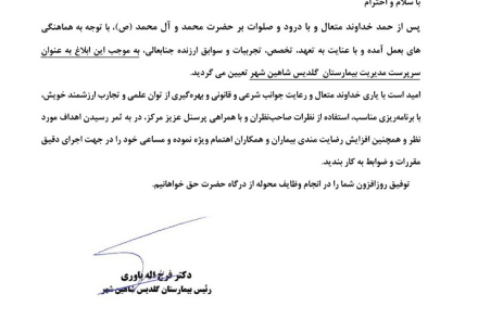 انتصاب سرپرست مدیریت بیمارستان گلدیس شاهین شهر روز 19 دی 1404 جناب آقای دکتر باوری ریاست بیمارستان گلدیس شاهین شهر طی حکمی ، جناب آقای مهندس اصغر شریف پو.ر را بعنوان سرپرست مدیریت بیمارستان گلدیس شاهین شهر منصوب نمودند.