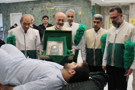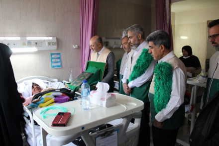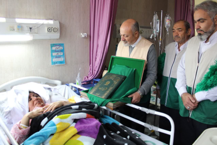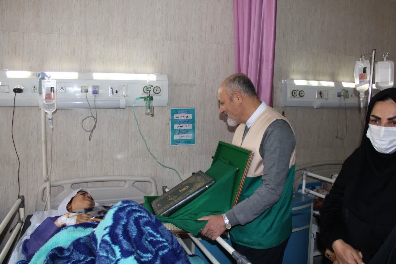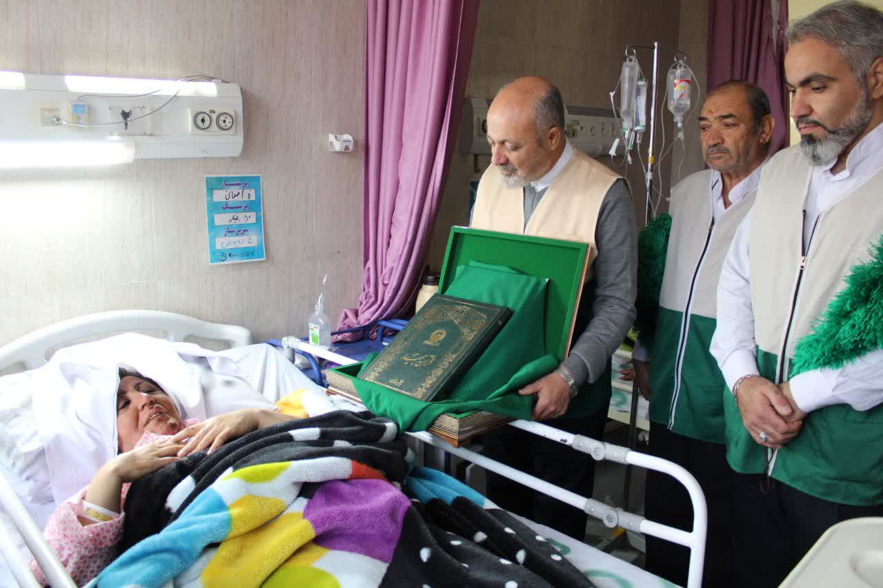 خادمیاران حضرت رضا(ع) با پرچم سبز بارگاه ملکوتیاش، قدم به تعدادی از بخشهای مختلف بیمارستان گذاشتند و با بیماران و همراهانشان دیدار کردند.